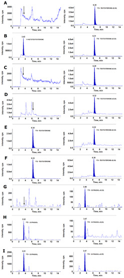 Ion chromatogram from the analysis of a female gonad sample: (A)—blank sample for 11-KT; (B)—sample spiked with 11-KT to the concentration of 5 ng/g; (C)—sample tested with no residues of 11-KT; (D)—blank sample for 17β-T; (E)—sample spiked with 17β-T to a concentration of 1 ng/g; (F)—sample with 17β-T at a concentration of 3.32 ng/g; (G)—blank sample for 17β-E2; (H)—sample spiked with 17β-E2 to a concentration of 2 ng/g; (I)—sample with 17β-E2 at a concentration of 2.50 ng/g.
