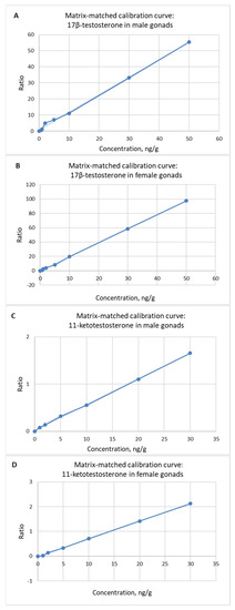 The obtained coefficients of determination (R2) were higher than 0.99 for 17β-T, 11-KT and 17β-E2 in female and male gonad samples (Table 3).