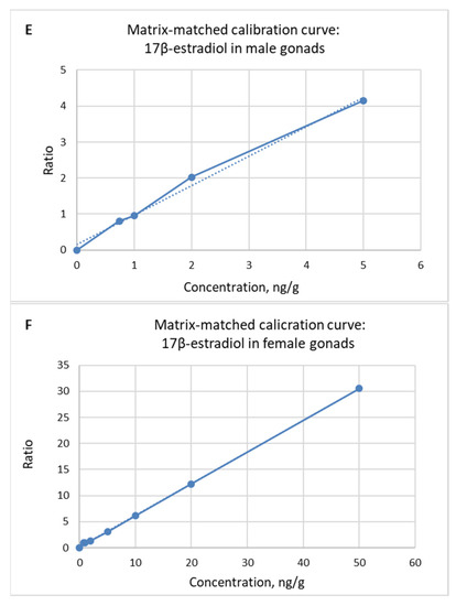 Linearity was evaluated using matrix-matched calibration curves prepared from peak-area ratios of 17β-T, 11-KT and 17β-E2 to the corresponding ISs. The calibration showed satisfactory linearity from 0 to 50 ng/g for 17β-T, from 0 to 30 ng/g for 11-KT and from 0 to 5.0 or from 0 to 50 for 17β-E2, regardless of the matrix being tested (Figure 6).