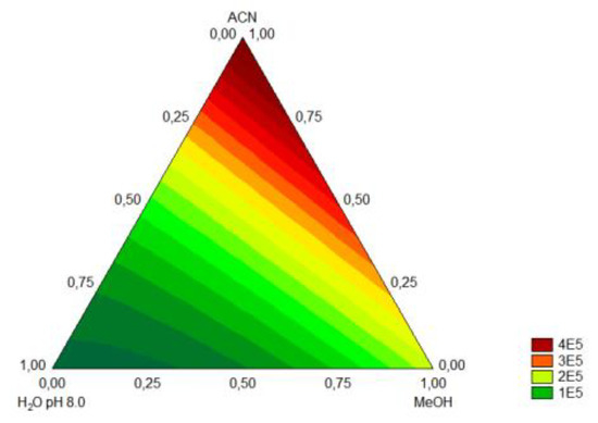 Response surface obtained for the selection of desorption solvent with simplex lattice design (Conditions: 3.5 mL of urine adjusted to pH 3.0 and spiked at 300 μg L−1. Extraction was performed with five cycles of 700 μL of sample using new aliquots, followed by two cycles of 300 μL of ultrapure water and desorption using five cycles of 200 μL of the solvent or mixture chosen for the experiment).