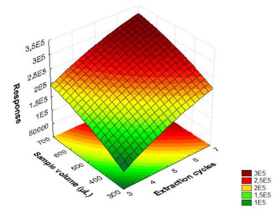 The influence of the number of extraction cycles and volume of sample in the efficiency of the DPX procedure was evaluated with a Doehlert design. The results are presented as a response surface in Figure 2, constructed using the geometric mean of the peak areas of the analytes for each experiment and a quadratic function with determination coefficient of 0.86368, showing a good correlation between the experimental data and the mathematical model proposed. As seen in Figure 2, the maximum values of both variables resulted in better extraction efficiencies; this could have been related to the increase of analyte available for extraction when a greater volume and more cycles were used, without saturating the extractor phase [25,26]. Thus, seven cycles using new aliquots of 700 μL of sample each, totalizing 4.9 mL of sample for the procedure, were selected as the optimum extraction condition.