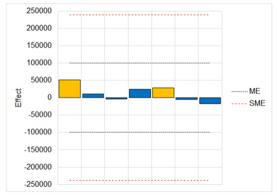 Finally, the robustness of the method was evaluated with the Youden test, where seven parameters that can affect the response were selected and small variations were tested, and the response was verified. The Lenth method allows the development of a graphical response to evaluate the method‘s robustness, as presented in Figure 3. According to this figure, there are two error margins, the margin error (ME) and the simultaneous margin error (SME), and when multiple factors are analyzed, the SME must be taken into account. When a parameter crosses one of these lines, it significantly affects the response. Since none of the parameters selected were significant, the method was considered robust [29,30].