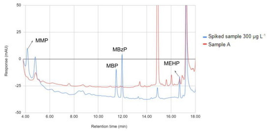 The optimized method was applied to four samples, and the results are presented in Table 3. Only sample A presented a MEHP lower than the LOQ, as can be seen in Table 3. A chromatogram of this sample is shown in Figure 4. In addition, a chromatogram of a blank sample is provided in Figure S9.