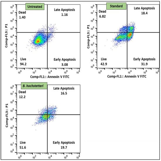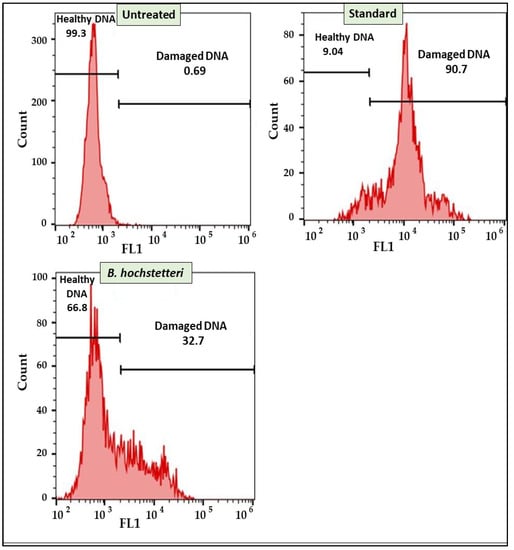 Furthermore, flow cytometry was used to determine DNA damage caused by the methanol extract of B. hochstetteri and the standard drug cisplatin via TUNEL assay. The results revealed that 90.70% of cisplatin-treated cells showed DNA damage, whereas in the methanol extract-treated and untreated cells, only 32.70 and 0.69% of cells, respectively, exhibited DNA damage. The results of the TUNEL assay are presented in Figure 4.