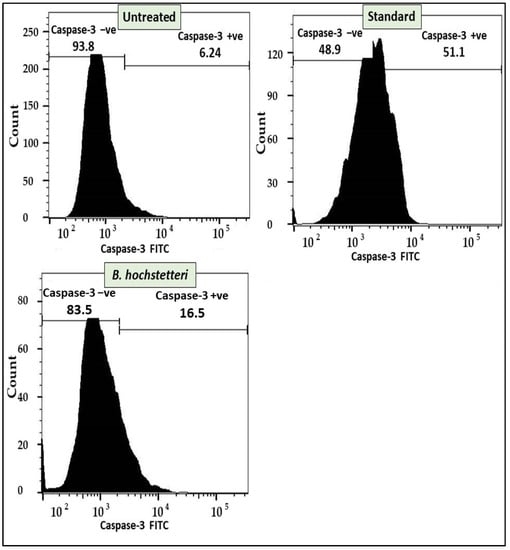 Caspase-3 activity was measured using a commercial kit (TACS kit), following the instructions from the manufacturer. Briefly, the MCF-7 and A549 cancer cell lines were pre-treated with caspase-3 inhibitor Z-DEVD-FMK (20 μM, BD Biosciences, Franklin Lakes, NJ, USA) for 2 h, followed by treatment with the required concentration of methanol extract of B. hochstetteri for 24 h. Caspase-3 activity was determined using a flow cytometer (Acquisition: 7.Cytomics FC500 Flow cytometer, Beckman Coulter, Brea, CA, USA) [20].