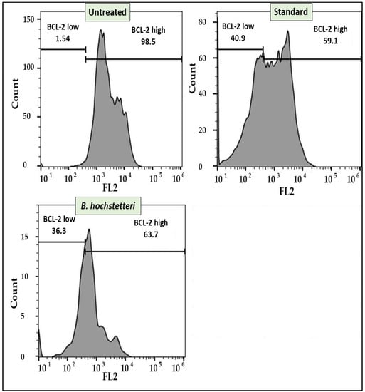 Flow cytometry was used to quantify the level of Bcl-2 protein in the MCF-7 and A549 cancer cell lines treated with methanolic extract of B. hochstetteri, according to the procedure described by Moraes et al. [21]. After treatment with the test sample at its IC50 concentration, the cell preparations were analyzed flow cytometrically within 30 min using FlowJo X 10.0.7 software.
