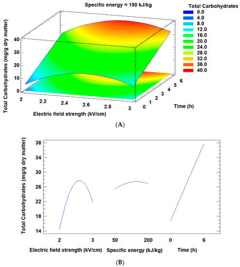 The electric field strength was the lowest significant factor in all studies; however, it was set at 2.5 kV/cm, obtaining the highest values for TEAC, ORAC, carbohydrates and total proteins. However, the behavior in the extraction of polyphenols was different, presenting its maximum at 3 kV/cm. This behavior agrees with that observed by several authors. For instance, in the study conducted by Darra et al. [] on grape pomace, it was observed that increasing the electric field from 400 to 800 V/cm improved the extraction of polyphenols, although this fact was also observed on A. bisporus, where an intense increase in recovery was observed when increasing the electric field strength []; however, regarding the antioxidant components evaluated by TEAC and ORAC, the behavior was similar to that observed for macronutrients, where an increase in the electric field strength promotes their degradation.