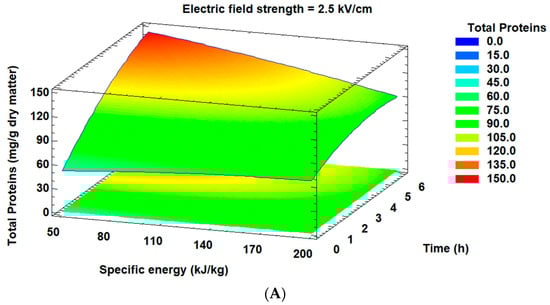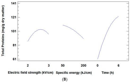The protein content was also influenced by the factors mentioned above (Figure 2). Similarly to carbohydrates, time had a significant impact (p < 0.05) on protein extraction, obtaining a higher recovery of protein with the elapse of treatment time. However, an opposite trend was observed for specific energy, finding a decrease in protein content as the specific energy increased. On the other hand, an increase in protein recovery was observed after increasing the electric field (p > 0.05) from 2 to 2.5 kV/cm, reaching a plateau after these conditions, then decreasing the recovery.