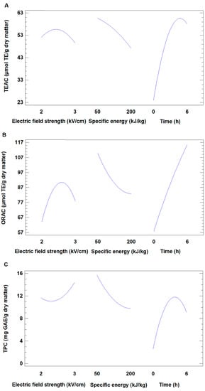 Therefore, the maximum recovery of antioxidant compounds would be obtained by applying 50 kJ/kg of specific energy maintaining a total extraction time of 5.6 h with a theoretical value of 67.94 µmol TE/g DM for TEAC, 161.41 µmol TE/g DM for ORAC and 22.16 mg GAE/g DM for TPC.