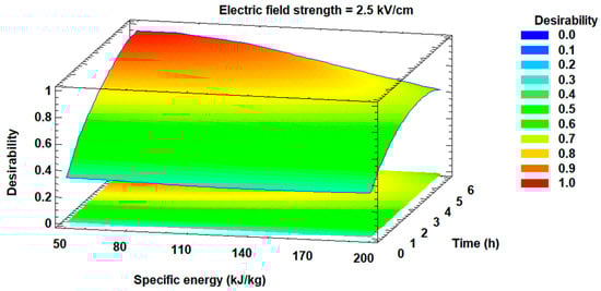 The simultaneous optimization of all the responses was carried out by the desirability function, in such a way that the extraction of all the compounds was maximized. The optimum conditions obtained were 50 kJ/kg for specific energy, 2.5 kV/cm for electric field strength and 6 h of total extraction time. As can be seen in Figure 4, the desirability obtained at the optimum conditions was 0.88. This result is due to the variability in the behavior of each of the compounds in relation to the factors; for example, a decrease in the extraction of antioxidant compounds measured by TEAC and TPC was found when an extraction time of 6 h was set, while the content of carbohydrates, proteins and antioxidant compounds measured by ORAC was maximized, presenting the opposite behavior.