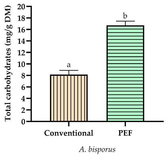 Total carbohydrate content (mg glucose (glu)/g dry matter (DM)) in conventional and pulsed electric field-assisted extraction (PEF) of A. bisporus. Different lowercase letters in the same parameter indicate statistical differences related to the extraction methodology.