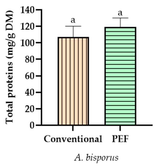 Total protein content (mg bovine serum albumin (BSA)/g dry matter (DM)) in conventional and pulsed electric field-assisted extraction (PEF) of A. bisporus. Different lowercase letters in the same parameter indicate statistical differences related to the extraction methodology.