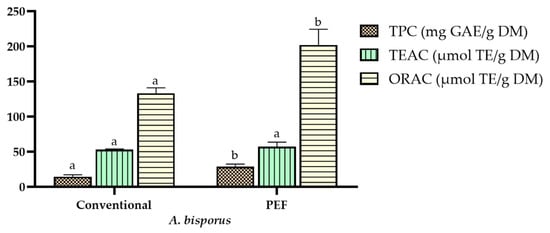 Total phenolic compounds (TPC) (mg gallic acid equivalents (GAE)/g dry matter (DM)), Trolox equivalent antioxidant capacity (TEAC) and oxygen radical antioxidant capacity (ORAC) (µmol Trolox equivalents (TE)/g dry matter (DM)) values in conventional and pulsed electric field-assisted extraction of A. bisporus. Different lowercase letters in the same parameter indicate statistical differences related to the extraction methodology.