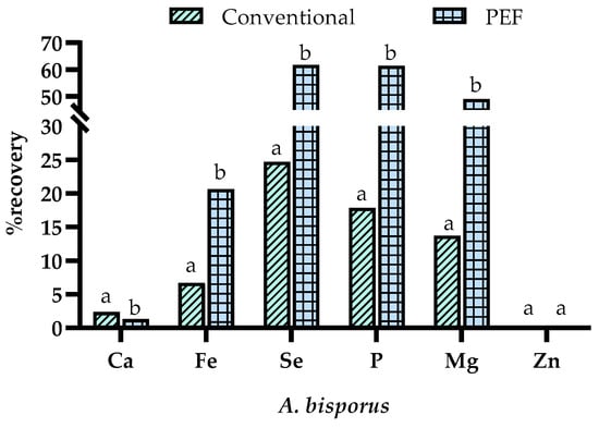 The percentage recovery of each mineral in conventional and pulsed electric field-assisted (PEF) extracts from fresh samples of A. bisporus. Different lowercase letters in the same mineral suggest significant differences in relation to the methodology applied.