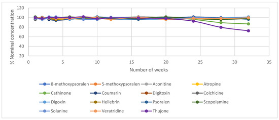 The calibration curves showed a linear response across the standard ranges shown in Table 4 with an R2 of greater than 0.995 for all 15 compounds. The methods also shown good precision with % CVs of 10.7%, 6.7% and 0.3% for the low, medium and high calibration points, respectively. Matrix matched calibration standards were analysed by diluting standard in dandelion extract and linearity and precision accessed. Minimal variation was observed in matrix matched standards. The limit of detection (LOD) and limit of quantitation (LOQ), both in solution and in the matrix matched standards, were determined. This was based on the calibration using the following equations, 3.3 δ/S and 10 δ/S for LOD and LOQ, respectively. Where δ is the standard deviation of the y intercept and s is the average of the slope. The LODs in solution ranged from 0.2 ng/mL for veratridine to 92 ng/mL for coumarin, with corresponding LOQs of 0.8 ng/mL and 308 ng/mL, respectively. In matrix data for LODs ranged from 8 ng/g for veratridine to 6.4 µg/g for coumarin, with corresponding LOQs of 24 ng/g and 21.3 µg/g, respectively. In assessing the concentration of the plant toxins in their matrices the LOQ, as determined in the matrix matched standards, was used. The stability of each compound, when stored at 2–8 °C, was assessed when stored in solution, in glass storage vials, by measurement of the analytical standard (at a concentration of 100 ng/mL for all, except coumarin which was at 5000 ng/mL) against the calibration data. This was initially done on a weekly based for the first 4 weeks, then on a 2-week basis for a further 8 weeks, and finally on a 4-week basis for the remainder of the study (Figure 1). It was noted that the majority of the compounds are stable when stored in methanol between 2–8 °C. However, some influence of storage conditions is noted for cathinone and thujone (Figure 1). A reduction in % nominal concentration was observed after a period of around 30 weeks and 25 weeks for cathinone and thujone, respectively. While this was not investigated further, fresh solutions were prepared on a 3 monthly basis to eliminate the possibility of degradation by storage conditions.