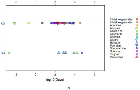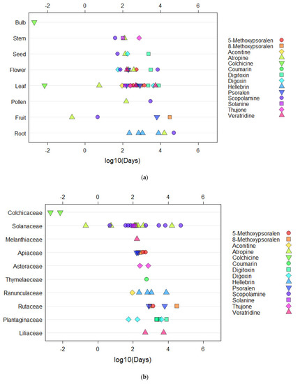 Dot plots investigating the human health risk based on the number of days exposure to reach the compound LD50, as expressed as toxicity (a) Influence of plant anatomy, (b) Effect of plant family, and (c) Positioning of plant anatomy (above or below ground).