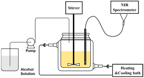 The experimental setup is shown schematically in Figure 1. An NIR immersion transflectance probe with a 2 mm optical path length (Hellma, Müllheim, Germany) was directly inserted into the glass container and connected to the spectrometer by optic fibers. During the precipitation process, a sample of approximately 5 mL was collected near the probe every 5 to 10 min for reference assays.