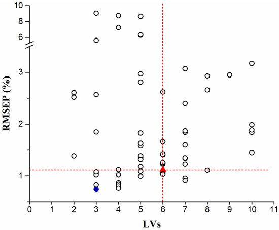 Next, predictive performance and model complexity were used as evaluation indices to further optimize the parameters of the pretreatment algorithms shown in Table 3. As a result, there were a total of 80 models constructed, as included in Figure 3. Take the red triangle as reference, which represents the model built from raw data. The performances of the models in the lower left part were improved by the pretreatments. Finally, the best pretreatments that yielded a simple model with the best predictive performance were chosen. For the seven analytes, the best pretreatment combinations are listed in Table 4.
