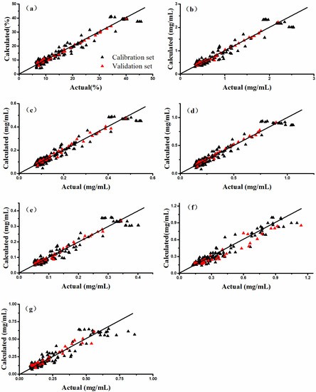 Correlation plots for reference values versus NIR predictions for the PLSR models of TS (a), CG (b), FG (c), DPGP (d), DDIFGP (e), AG II (f), and AG IV (g).