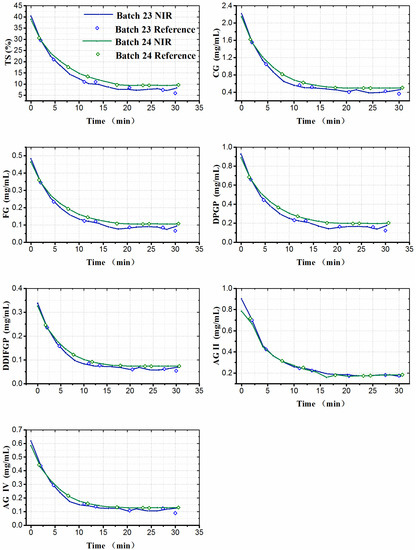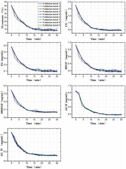 The established calibration models were used to predict the contents of the seven analytes during the second alcohol precipitation process under normal operating conditions. Figure 5 shows the in-line monitoring results of nine alcohol precipitation batches. To further evaluate the model performance, 54 samples in validation set 2 were collected for reference assays from the nine batches. The newly added parameter of RSEP together with RMSEP and R were used to evaluate the different aspects of the model quality. Table 5 shows the chemometric validation parameters of the quantitative models for the seven analytes. The results demonstrate that the models still present a good overall predictive performance for the samples in the independent new batches. Compared with the parameters in Table 4, the difference in RMSEP values is low. In addition, the first four models for TS, CG, FG, and DPGP perform better than the models for DDIFGP, AG II, and AG IV regarding the RSEP values.