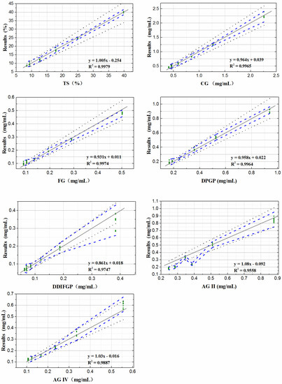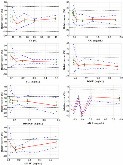 The range of an analytical procedure is the interval between the upper and lower amounts of analyte in a sample for which it has been demonstrated that the analytical procedure has a suitable level of precision, accuracy, and linearity [26]. According to Figure 6, the range between the lower and upper limits of quantification can be obtained where the relative β-expectation tolerance limits are included within the acceptance limits. The range for each quantification model is listed in Table 8. For the first four analytes, the established NIR models were able to predict accurate results over more than 90% of the content range for the second alcohol precipitation process. However, for the last three models, accurate results could be guaranteed within the higher content ranges for the process. Of the seven analytes, the content of DDIFGP was the lowest in the samples, which may be close to the sensitivity limit of the NIR spectrometer, which may be prone to large prediction errors. For AG II and AG IV, as the HPLC-ELSD method was applied as the reference quantitative method, which is less accurate than the HPLC-UV method, the prediction models yielded narrower valid ranges than the three models for CG, FG, and DPGP. Moreover, the complexity of the changing system during the in-line analysis and the existence of the alcohol-insoluble impurities made it more difficult to obtain more accurate models.