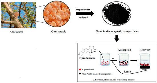 The increased health risk caused by the random disposal of pharmaceuticals in aqueous medium has caused serious problems owing to their negative impacts on the environment [5,6]. This is because pharmaceuticals are only partly metabolized in the human body after ingestion, with 20–80% of the unmetabolized residues being discharged into the environment in a pharmacologically active form. Numerous pharmaceutical active compounds are directly or indirectly released into the environment [7,8]. However, domestic waste, hospital waste, pharmaceutical industry by-products, and human urine are the main sources of drug contamination [9,10]. The vital antibacterial agents utilized in human and veterinary medicine are fluoroquinolone antibiotics [11,12,13,14]. Ciprofloxacin (CIP) is a wide antibiotic spectrum that is extensively used to prevent post-operative infection following intra-abdominal surgery [15,16], the characteristics of which are presented in Table 1. A wide range of approaches have been used for the removal of CIP from various water sources. These include: photodegradation [17,18], ozonation, photo-Fenton [19], Fenton oxidation process [20], and adsorption. Antibiotics can be effectively removed from the aqueous solution via an adsorption process [13,21]. To date, various adsorbents for CIP removal such as titanium carbide [22], humic acid coated magnetic biochar [23], nano-hydroxyapatite [24], multiwall carbon nanotube [25], activated carbon, montmorillonite [26], and Graphene oxide [27] have been recorded. However, some of these adsorbents are highly expensive, toxic, and difficult to regenerate after use. Therefore, an ecofriendly, less expensive, easy to recover, biocompatible, and less toxic adsorbents need to be produced. Natural supporting adsorbents from plant sources such as Gum Arabic (GA) can be explored.