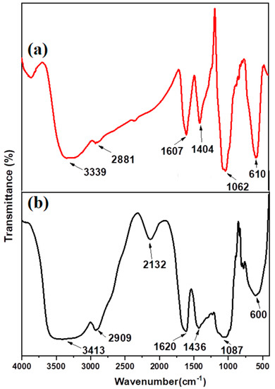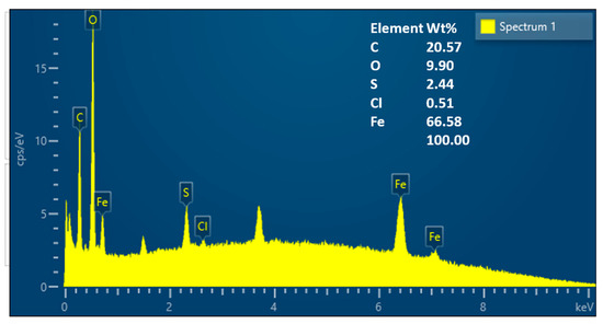 The FTIR spectra of GA and GA-MNPs are given in Figure 2. The spectrum of GA in Figure 2a showed the peaks at 3339, 2881, and 1607 cm−1 were attributed to the –OH stretching, –CH2 stretching vibration, and C-O asymmetric stretching vibrations, respectively. The peak at 1404 cm−1 is assigned to the wagging vibrations for –CH. The C–O–C linkage appeared at 1062 cm−1, where the peak at 610 cm−1 could be assigned for the –C–H out-of-plane bending vibration. The spectrum of GA-MNPs in Figure 2b showed increased intensity for the peak at 1620 cm−1 with a very slight shift, indicating the formation of hydrogen bonding between the GA and the MNPs. The absorption bands at 600 cm−1 could be attributed to Fe–O bonds due to their stretching vibration mode in the crystalline lattice of GA-MNPs [49]. Moreover, the peak at 1436 cm−1 showed an increase in intensity, indicating the interaction between the carboxylic functional group of GA and the hydroxyl group on the surface of MNPs [46]. The morphological characterization of the synthesized GA-MNPs material was analyzed using SEM. The spherical shape of the Fe3O4 nanoparticles—which exhibited rough and agglomerated morphology due to magnetism and high surface energy—confirm the successful synthesis of MNPs as can be seen in Figure 3a. However, the surfaces of GA and GA-MNPs were smooth as depicted in Figure 3b,c. This suggests that the agglomeration decreased upon coating with GA. Figure 4. shows clear EDX peaks of C (20.57%), Fe (66.58%), and O (9.90%) in the adsorbent. This proves the successful formation of GA-MNPs and correlates with the FTIR results of the nanoparticles.