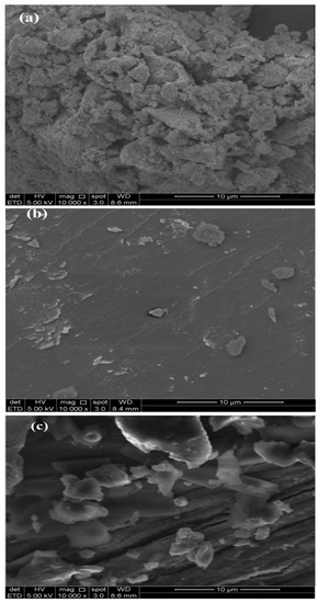 SEM images for (a) Fe3O4, (b) GA, and (c) GA-MNPs.