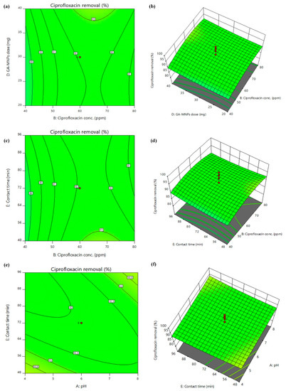 Contour plots and 3D response surface plots of CIP removal reveal the interactive effects of (a,b) CIP conc. and GA-MNPs dose, (c,d) CIP conc. and contact time, (e,f) pH, and contact time.