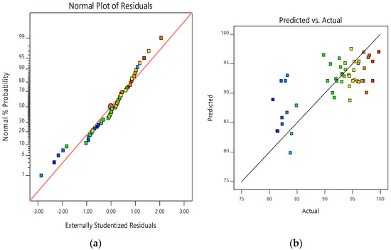 Design-expert plots of (a) normal probability curve of the residuals and (b) relationship between actual values and predicted values for CIP removal.