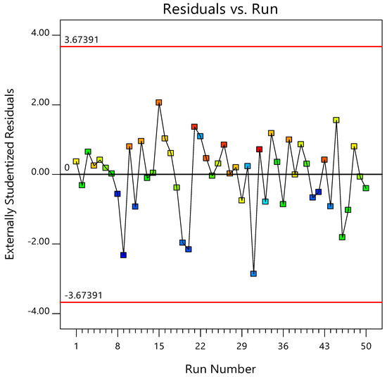 Figure 6 depicts the link between actual and predicted values. The experimental and predicted response values have a favorable association. Figure 7 demonstrates the association between externally studentized residuals and CIP removal. It also demonstrates a strong link between the variables.