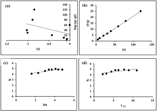 To determine the most effective kinetic model, the data for the batch adsorption study were studied via pseudo-first order, pseudo-second order, Elovich, and intra-particle diffusion, as indicated by Equations (4)–(7), respectively [53].