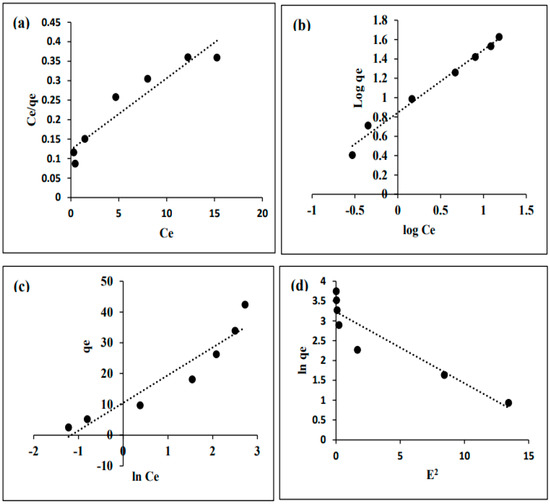 The adsorption rate b (mg L−1) and the Langmuir constants for the adsorption capacity qm (mg g−1) are derived from the linear plot versus with 1/ slope and intercept of 1/b. Ce is the adsorbate equilibrium concentration (mg L−1). The intercept value of log KF and slope value of 1/nF were obtained by plotting log qe versus Ce. KF signifies the adsorption intensity of the adsorbate on the adsorbent material as well as the bonding energy constant. If the value of nF is greater than one, it shows that the adsorption circumstances are favorable [48,49]. Derived from the plot of qe versus lnCe, KT signifies the equilibrium binding constant (L mg−1), βT = RT/b is the Temkin isotherm constant linked to the heat of adsorption, T is the temperature in kelvin, R gas constant, and b is the Tempkin isotherm constant. The adsorption free energy per mole of the adsorbate E (J mol−1), and (mol2 J−2) is the Dubinin–Radushkevich constant related to free energy.