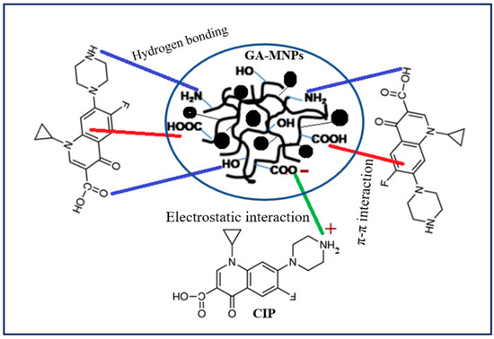 Mechanism for CIP adsorption onto the GA-MNPs.