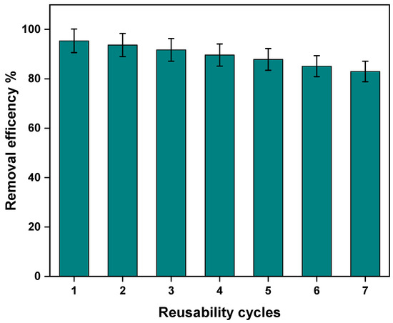 In this work, the percentage removals of CIP were determined at seven (7) successive cycles. After the adsorption of CIP, the adsorbed and saturated GA-MNPs was dispersed in a 40% methanol solution, agitated for 6 h at room temperature, and washed three times. Subsequently, the regenerated GA-MNPs was again used to absorb CIP. The desorbed samples were then collected using the suction filtering technique and rinsed with distilled water. To reuse the samples in the next round of adsorption studies, they were finally dried in an oven at 70 °C. Figure 12 shows the effect of the number of regeneration cycles on the CIP adsorption capacity of GA-MNPs. High removal percentage was maintained by the adsorbent until the third cycle (91.73%). Subsequent removal trials in the fourth, fifth, sixth, and seventh cycles showed a slight decline in the adsorption of CIP by (5.74, 7.53, 10.26, and 12.41%), respectively. This can be due to the loss of a slight amount of adsorbent during the recycling process. Despite the slight reduction in the removal of CIP, the GA-MNPs still retained >80% removal efficiency after the seventh cycle.