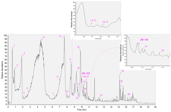 The following supplementary materials can be downloaded at: https://www.mdpi.com/article/10.3390/separations9110329/s1. Supplementary Files S1–S36: UPLC-Q-Orbitrap-MS spectra and identification of 1–36.