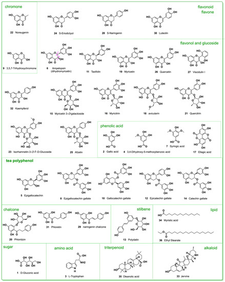 As seen in Figure 3, the 36 bioactive compounds (1–36) can be classified into 11 types: chromone, flavonoid, phenolic acid, tea polyphenol, chalcone, stilbene, lipid, sugar, amino acid, triterpenoid and alkaloid. The flavonoids, however, can be further classified into two subtypes: one was flavone; while another was flavonol (including flavonol glucoside). Interestingly, the parent skeleton of flavone was actually noreugenin (22), while the parent skeleton of flavonol was 3,5,7-trihydroxychromone (9). This means that the plant A. grossedentata may utilize two chromones as parents to biosynthesize the corresponding flavones and flavonols.