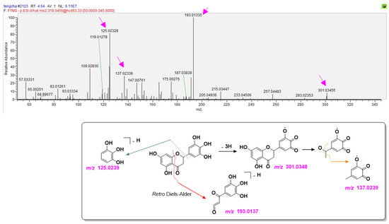 The typical MS/MS spectra of R.T. 4.54 min peak from the lyophilized aqueous extract of vine tea (upper) and the proposed ampelopsin elucidation (below). The m/z values in purple are the calculated ones. The m/z calculation was based on the relative atomic masses of C (12.0000), H (1.007825), O (15.994915), and N (14.003074).