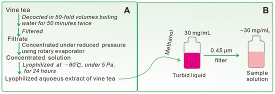 According to the previous method [64,65], the lyophilized aqueous extract of vine tea was prepared through four steps: decoction, filtration, concentration and lyophilization. Subsequently, the lyophilized aqueous extract was redissolved in methanol and filtered through a 0.45 μm membrane, in line with the method [66,67]. The whole preparation process of lyophilized aqueous extract of vine tea is summarized in Figure 6.