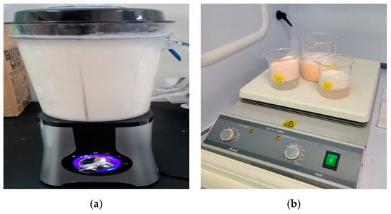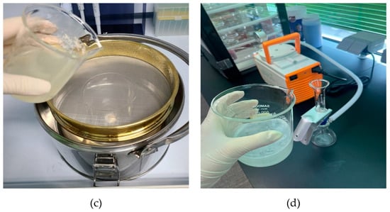Shrimp stored frozen at −20 °C was thawed at room temperature to determine the weight and length of the thawed shrimp. All experimental instruments used for pretreatment were washed with tertiary distilled water and then stored and dried in a closed space to ensure that other contaminants did not intervene. The order of pretreatment is to wash the shrimp in tertiary distilled water. After immersing the shrimp in a 30% hydrogen peroxide solution, grind the shrimp finely using a stainless steel mixer washed with distilled water. Decomposition of organic matter was carried out for 3 days in a 30% hydrogen peroxide solution (H2O2: CAS No. 7722-84-1) in a heating stirrer set at 40 °C and 150 rpm [14,15]. After the decomposition of organic matter, foreign substances were separated by using a 300 μm size sieve. Prume et al., 2021 confirmed the sample reproducibility and high recovery rate for >300 μm in the microplastic quantification step [16]. The sample after completing the foreign matter separation was filtered under reduced pressure using a stainless-steel mesh filter to filter out microplastics. After the material separation was completed, microplastics were filtered through a stainless filter using a vacuum filtration device. The microplastic filter used was made of stainless steel with a pore size of 20 μm and a diameter of 25 mm. The filtered filter was dried in a dry oven at 40 °C for more than 4 h, and then placed in a desiccator for 1 day and analyzed. Figure 2 shows the pre-treatment photos of shrimp in 4 stages.