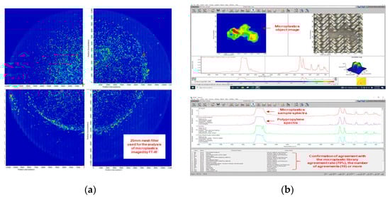 Microplastic mesh filter image and microplastic identification process: (a) A 25 mm mesh filter used for the analysis of microplastics imaged by FTIR microscope; (b) Determination of microplastics using software.