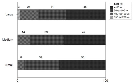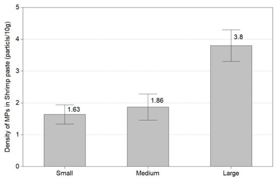Figure 7 shows the size of microplastics by the size of the shrimp. The microplastic ratio by the size of small shrimp was found to be 53% under 50 μm, 39% between 50 μm and 100 μm, and 8% between 100 μm and 150 μm. The microplastic size ratio of medium-sized shrimp was 46% under 50 μm, 39% between 50 μm and 100 μm, and 14% between 100 μm and 150 μm. The microplastic size ratio of large shrimp was found to be 46% under 50 μm, 31% between 50 μm and 100 μm, and 3% between 100 μm and 150 μm. In most shrimp, the proportion of microplastics less than 100 μm was high from 77% to 92%.