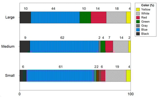 Figure 8 expresses the color of microplastics by the size of the shrimp. The microplastic color of small-size shrimp resulted in the order of blue 61%, white 18%, black 6%, red 6%, green 2%, yellow 4%, and gray 2%. The microplastic color in medium size shrimp was reported in order of blue 63%, white 14%, red 7%, green 4%, yellow 2%, and gray 2%. The color of microplastics in large-size shrimp was confirmed to be blue 44%, white 18%, red 14%, green 11%, black 10% and yellow 4%. In all three sizes of shrimp, blue was identified with the highest ratio.