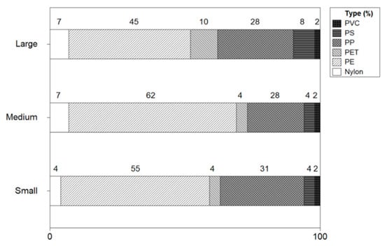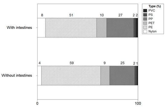 The type of plastic was analyzed based on FTIR microscope and PE (45 to 55%), PP (21 to 31%), PET (4 to 11%), PS (4 to 8%), PVC (2%), and nylon (4 to 7%) were identified in the order. Additionally, Ugwu et al. (2021) estimated that the major polymers found in vertebrates were polyethylene 27.3%, polypropylene 14.3%, rayon 11.7%, and polyester 10.4% [21]. These polymers are widely used as materials for food packaging, clothing, fishing gear, etc. [25,26].