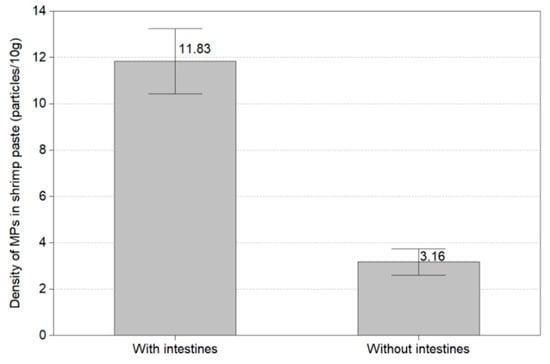 In this study, the accumulation pathway of microplastics in shrimp was confirmed through the presence or absence of the head and intestines of shrimp from Litopenaeus vannanmei from Korea. The amount of microplastics in the shrimp with intestines and heads was 11.83 MPs/10 g, which resulted in a higher microplastic level compared to 3.16 MPs/10 g for shrimp without intestines and heads. Li et al. (2021) investigated the effect of microplastics on the growth of shrimp and confirmed that PE and PS remained in the intestines [20]. Curren et al. (2020) studied microplastics in three types of shrimp and confirmed that the microplastics in the intestines of shrimp varied from 13.4 MPs/g to 7050 MPs/g [27]. These experiments confirmed that the amount of microplastic in the intestines and heads of the shrimp was higher than that of the shredded shrimp.
