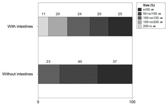 Figure 11 shows the size of microplastics with and without the intestines and heads of shrimps. The ratio of the number of microplastics in shrimps with the intestines and head resulted to be 50 μm 25%, <50 to 100 μm 20%, <100 μm to 150 μm 24%, <150 μm to 200 μm 20%, and >200 μm 11%. The microplastic size ratio of shrimp without intestines and heads was 50 μm 37%, <50 to 100 μm 40%, and <100 μm to 150 μm 23%. The microplastic size of shrimp without the intestines and head was 150 μm or less, whereas 11% of microplastics of 200 μm or more were confirmed in shrimp with the intestines and head. It was confirmed that microplastics with a size of 200 μm or larger were included in the intestine and head of the shrimp.