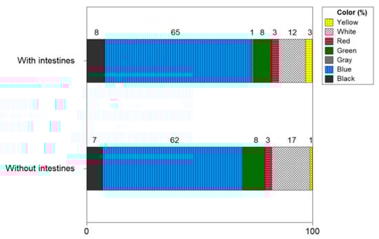 Figure 12 shows the color of microplastics with and without shrimp intestines and heads. The microplastic color of the shrimp with intestines and heads was confirmed in the following order: blue (60%), white (12%), black (8%), green (8%), red (3%), yellow (3%), and gray (1%). In shrimp without intestines and heads, microplastics were identified in the following order: blue (62%), white (17%), green (9%), black (7%), red (3%), and yellow (1%). Blue was the main color of microplastics in shrimp with intestines and heads and shrimp without intestines and heads, and there was no significant difference in other colors.