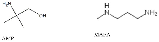 In this work, aqueous mixtures of 2-amino-2-methyl-1-propanol (AMP) and 3-(methylamino)propylamine (MAPA) are investigated. Their structures are shown in Figure 1. AMP is considered as a sterically hindered amine, whereas MAPA is a diamine containing one primary and one secondary amine group. Both were suggested as constituents of novel phase change solvent systems, which usually are aqueous solutions of amine mixtures that exhibit liquid–liquid (VLLE) phase separation upon increase of temperature. The phase split of such solvent systems allows the regeneration of only the CO2 rich phase, which is usually the aqueous one, resulting in decreased energy demands [8,9,14]. In this direction, Zhang suggested the addition of AMP in a phase change aqueous N,N-dimethylcyclohexyl amine (DMCA)-N-methylcyclohexyl amine (MCA) mixtures [14], as the addition of AMP increases the lower critical solution temperature above 40 °C, without compromising the absorption or desorption performance of the phase-change solvent [14]. Subsequently, the phase behavior of such system was investigated by Tzirakis et al., who also screened the absorption ability of several phase change solvents [15], including aqueous DMCA–MAPA mixtures [16]. However, the most studied MAPA containing phase change solvent is the aqueous DEEA–MAPA system, which was suggested by Pinto et al. [17]. In such solvent systems, ΜAPA is used as an absorption activator, according to the classification suggested by Zhang [14], as it exhibits high CO2 solubility and fast kinetics.