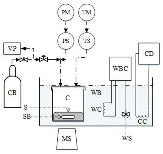 Experimental apparatus for VLE measurements consisting of: equilibrium cell (C), solution (S) weighted CO2 flask (CB), cooling coil (CC), cooling device (CD), magnetic stirrer (MS), pressure indicator (PM), pressure sensor (PS), stirring bar (SB), temperature indicator (TM), Pt-100 thermometer (TS), vacuum pump (VP), water bath (WB), temperature controller/heater (WBC), heating coil (WC), and stirrer (WS). Reproduced from [23], with permission from Elsevier.