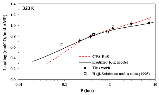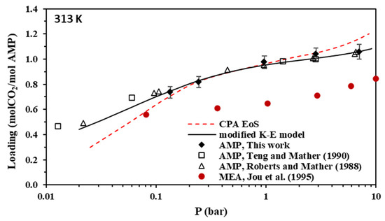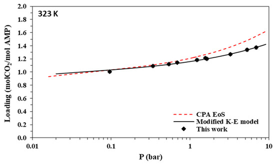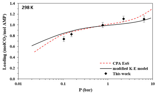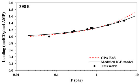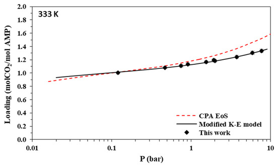 Using the parameters of Table 12, model-predicted CO2 loadings were compared to the experimental data of this work. The results for 2 M AMP and 3.35 M MAPA aqueous solutions are illustrated in Figure 3, Figure 4, Figure 5, Figure 6, Figure 7, Figure 8, Figure 9 and Figure 10 and, as parity plots, in Figures S7 and S8 of the supplementary information file. The obtained deviations of model correlations from the experimental data of this work are shown in Table 10 and Table 11, for AMP and MAPA solutions, respectively. In more detail, using two parameters adjusted to the experimental data (A and D parameters of Table 12 for K1 AMP), the model presents an overall percentage average deviation from the experimental data of this study equal to 3.7%. Using two additional adjustable parameters for MAPA (A and D parameters of Table 12 for K1 MAPA and K2 MAPA), the observed deviations are significantly lower and equal to 1%. Such rather low deviations reveal that the model, although very approximate, allows the correct description of the experimental data if appropriate values of the adjustable parameters are selected, i.e., effective values that, according to Jou et al. [52], absorb all non-idealities of the system. Compared to the CPA EoS, it presents significantly more accurate correlations, however, using more adjustable parameters.